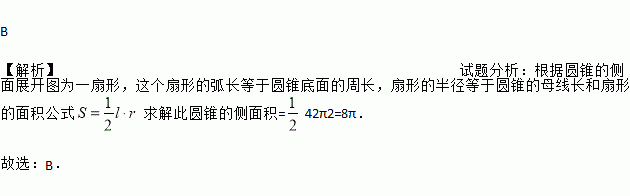 圆锥的母线长为4,底面半径为2,则此圆锥的侧面积是 ( )
