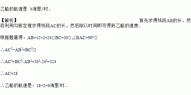 如图,甲乙两船同时从A港出发,甲船沿北偏东35°的方向,以每小时12海里的速度向B岛驶去.乙船沿南偏东55°的方向向C岛驶去,2小时后,两船同时到达了目的地.若C、B两岛的距离为30海里,问乙船的航速是多少?