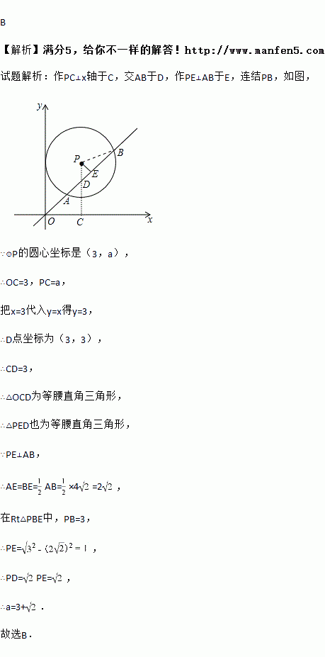 如图,在平面直角坐标系中,⊙P的圆心坐标是(3,a)(a>3),半径为3,函数y=x的图象被⊙P截得的弦AB的长为4,则a的值是( )
