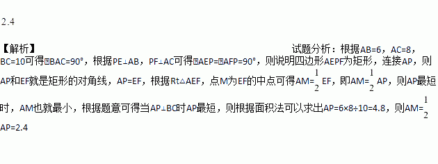 如图,在△ABC中,AB=6,AC=8,BC=10,P为边BC上一动点,PE⊥AB于E,PF⊥AC于F,M为EF中点,则AM的最小值为______.