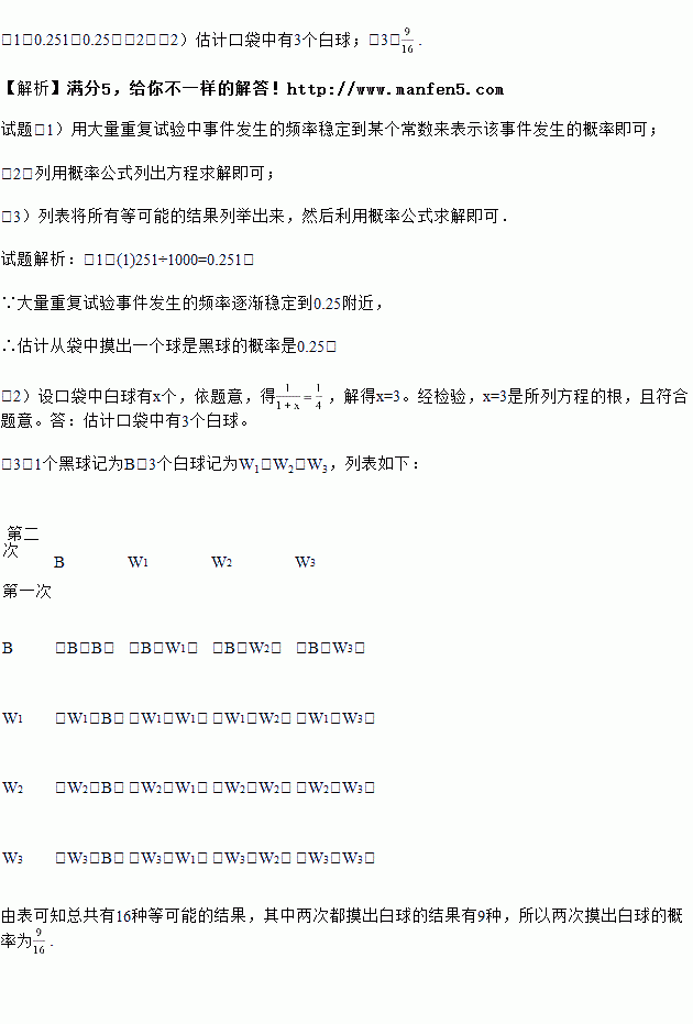 王老师将1个黑球和若干个白球入放一个不透明的口袋并搅匀,让若干学生进行摸球试验,每次摸出一个球(有放回),统计数据如下表:
