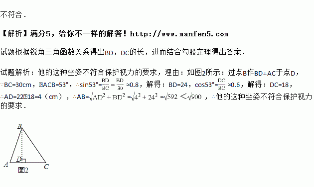 人写字时眼睛和笔端的距离超过30cm时则符合保护视力的要求.图1是一位同学的坐姿,把她的眼睛B、肘关节C和笔端A的位置关系抽象成图2的△ABC,BC=30cm,AC=22cm,∠ACB=530,她的这种坐姿符合保护视力的要求吗?请说明理由.(参考数据:sin530≈0.8,cos530≈0.6,tan530≈1.3)