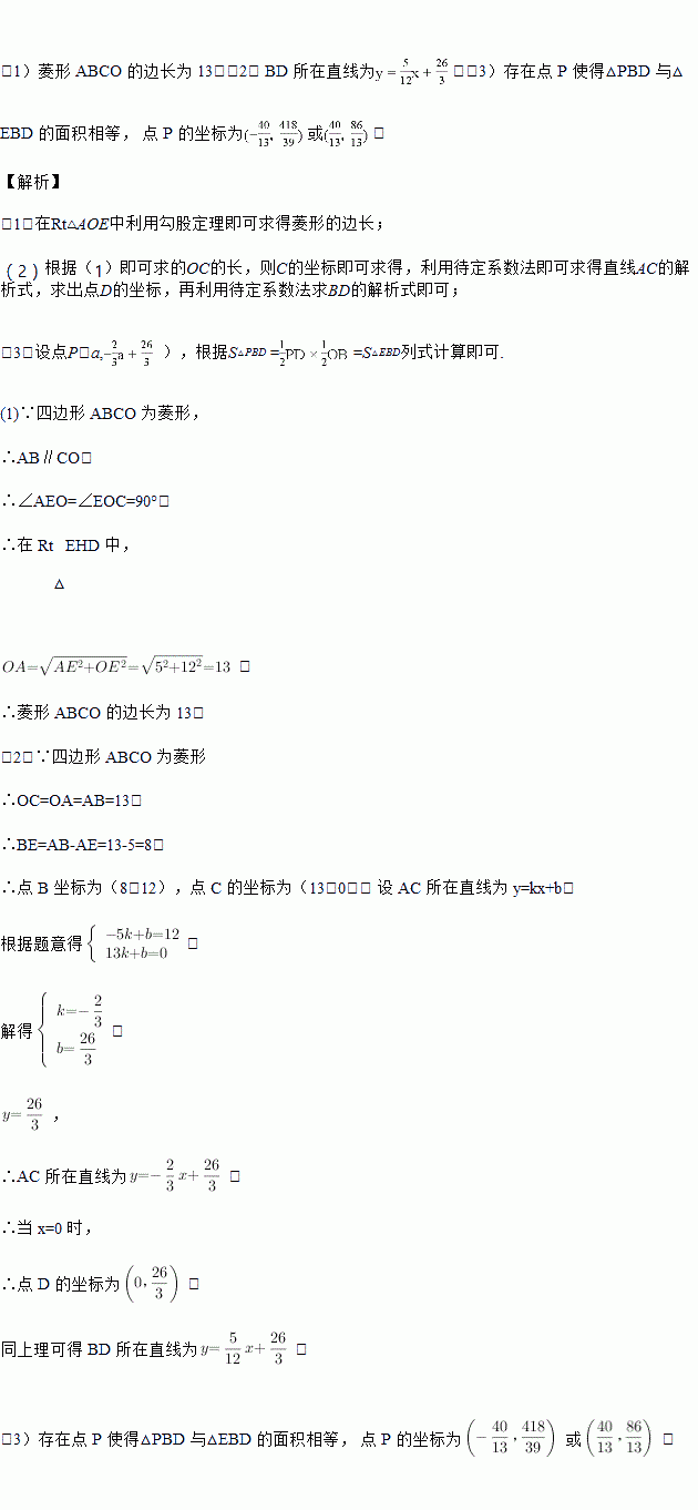 如图,四边形 ABCO 是菱形,以点 O 为坐标原点,OC 所在直线为轴建立平面直角坐标系.若点 A 的坐 标为(-5,12),直线 AC、边 AB 与![]()