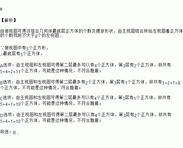 从不同的方向看同一物体时,可能看到不同的图形.其中,从正面看到的图叫主视图,从左面看到的图叫左视图,从上面看到的图叫俯视图.由若干个(大于个)大小相同的正方体组成一个几何体的主视图和俯视图如图所示,则这个几何体的左视图不可能是( )![]()