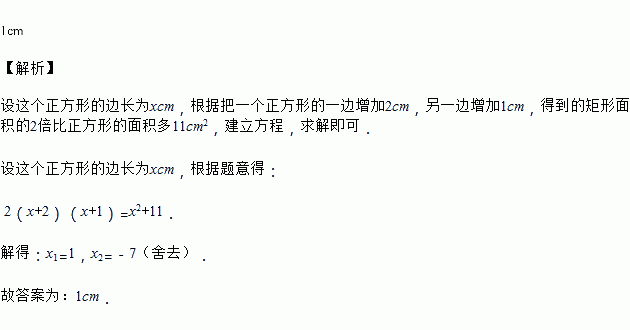 把一个正方形的一边增加,另一边增加,得到矩形面积的倍比正方形面积多,则原正方形边长为________.
