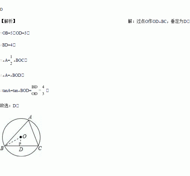 如图,△ABC内接于半径为5的⊙O,圆心O到弦BC的距离等于3,则∠A的正切值等于( )