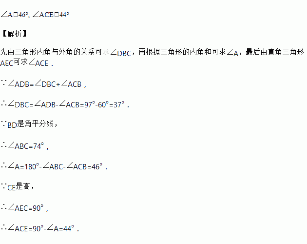 如图,在△ABC中,BD是∠ABC的平分线,CE是AB边上的高,且∠ACB=60°,∠ADB=97°,求∠A和∠ACE的度数.