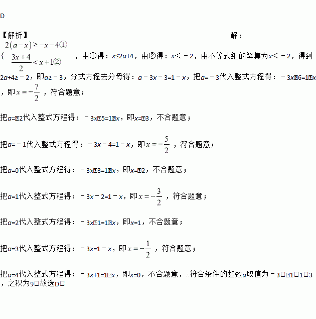 如果关于x的分式方程有负分数解,且关于x的不等式组的解集为x<﹣2,那么符合条件的所有整数a的积是( )