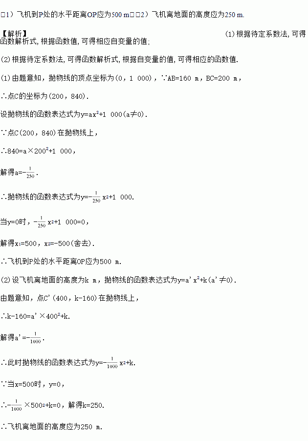 (2)根据当时的风力测算,空投物资离开A处的竖直距离为160 m时,它到A处的水平距离将增至400 m.要使飞机在(1)中的点O正上方空投物资到P处,飞机离地面的高度应为多少?