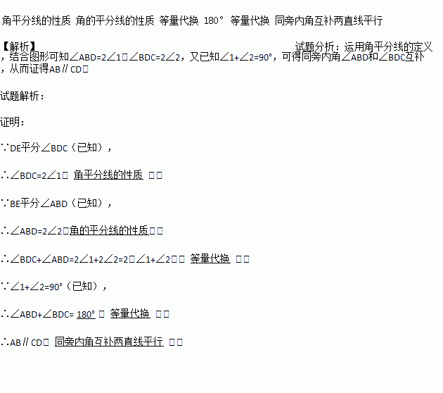 已知:如图.BE平分∠ABD,DE平分∠BDC,且∠1+∠2=90°.求证:AB∥CD.
