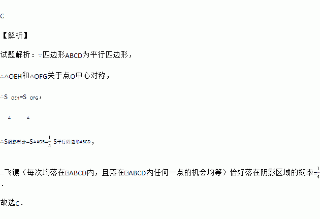 如图,ABCD的对角线AC、BD相交于点O,EF、GH过点O,且点E、H在边AB上,点G、F在边CD上,向?ABCD内部投掷飞镖(每次均落在?ABCD内,且落在?ABCD内任何一点的机会均等)恰好落在阴影区域的概率为( )