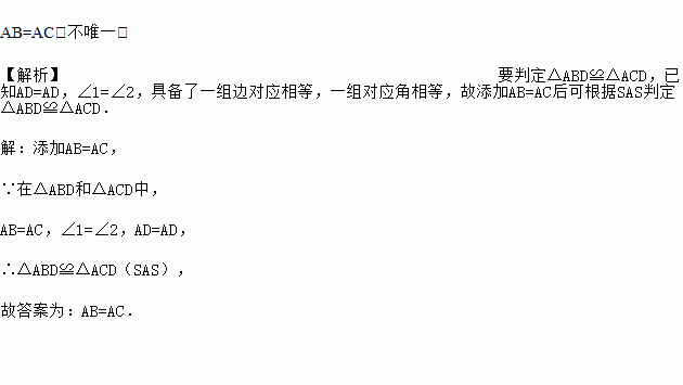 如图,已知∠1=∠2,请你添加一个条件______,使得△ABD≌△ACD.(添一个即可)