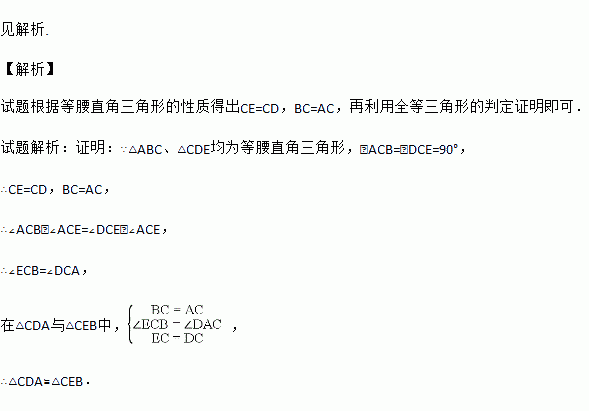 如图,△ABC,△CDE均是等腰直角三角形,∠ACB=∠DCE=90°,点E在AB上,求证:△CDA≌△CEB.