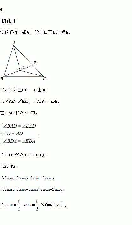 如图,已知S△ABC=8m2,AD平分∠BAC,且AD⊥BD于点D,则S△ADC= m2.