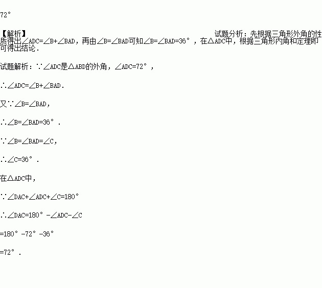 如图,点D是△ABC的边BC上的一点,∠B=∠BAD=∠C,∠ADC=72°.试求∠DAC的度数.