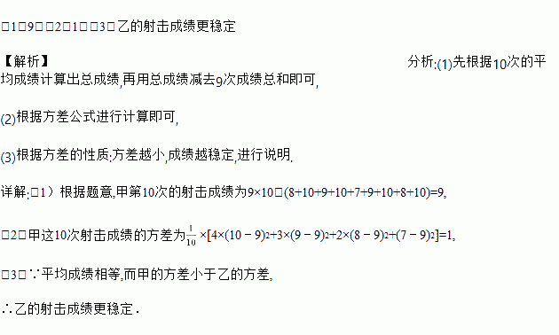 (3)乙在相同情况下也进行了10次射击训练,平均成绩为9环,方差为1.6环2,请问甲和乙哪个的射击成绩更稳定?