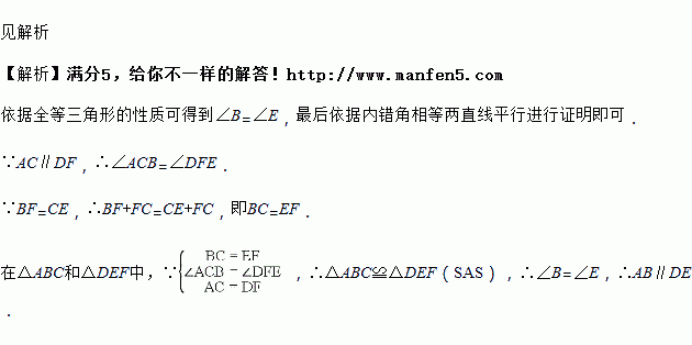 如图,在△ABC 和△DEF 中,点 B、F、C、E 在同一直线上,BF=CE,AC∥DF 且 AC=DF. 求证:AB∥DE.