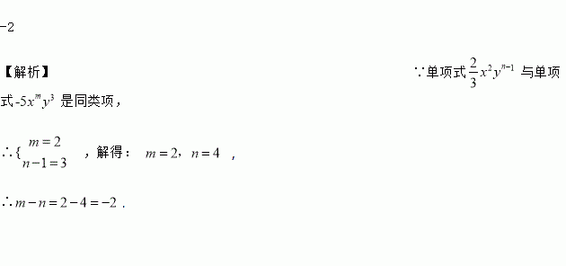 若单项式 x2yn﹣1与单项式﹣5xmy3是同类项,则m﹣n的值为_____.