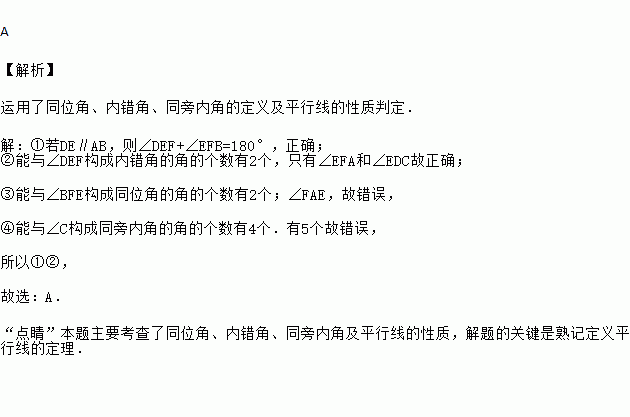 ①若DE∥AB,则∠DEF+∠EFB=180º; ②能与∠DEF构成内错角的角的个数有2个;