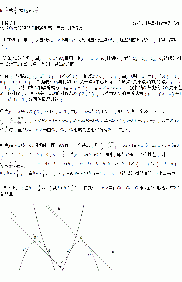 抛物线C1:y=x2﹣1(﹣1≤x≤1)与x轴交于A、B两点,抛物线C2与抛物线C1关于点A中心对称,抛物线C3与抛物线C1关于点B中心对称.若直线y=﹣x+b与由C1、C2、C3组成的图形恰好有2个公共点,则b的取值或取值范围是_____.