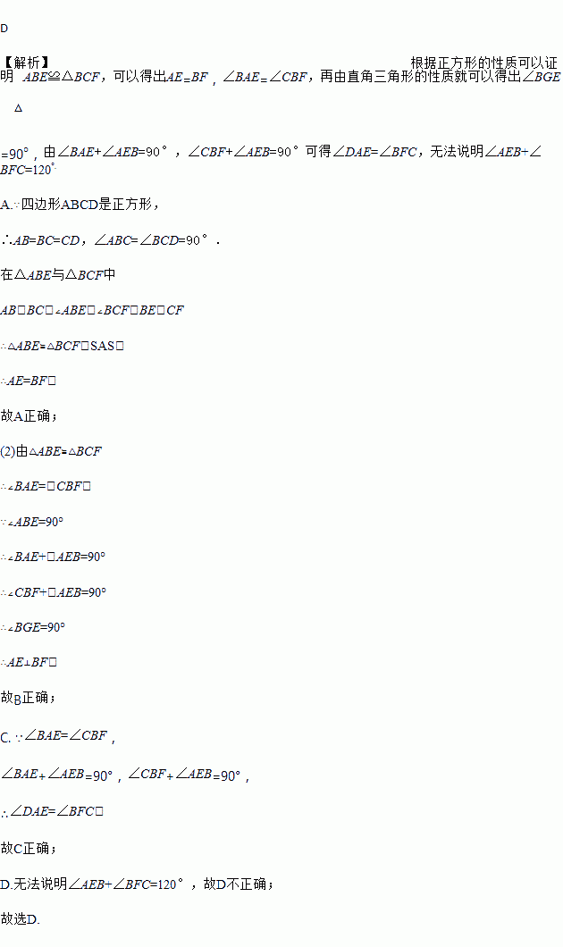 如图,正方形ABCD中,点 E、F 分别在边 BC、CD 上,且 BE=CF.连接 AE、BF.下列结论错误的是()