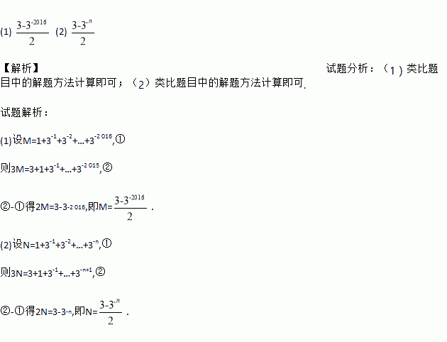 (1) (2) 【解析】试题分析:(1)类比题目中的解题方法计算即可;(2)类比题目中的解题方法计算即可. 试题解析: (1)设M=1+3-1+3-2+…+3-2 016,① 则3M=3+1+3-1+…+3-2 015,② ②-①得2M=3-3-2 016,即M=. (2)设N=1+3-1+3-2+…+3-n,① 则3N=3+1+3-1+…+3-n+1,②...