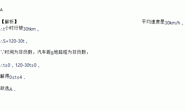 汽车由A地驶往相距120 km的B地,它的平均速度是30 km/h,则汽车距B地的路程s(km)与行驶时间t(h)的函数关系式及自变量t的取值范围是( )