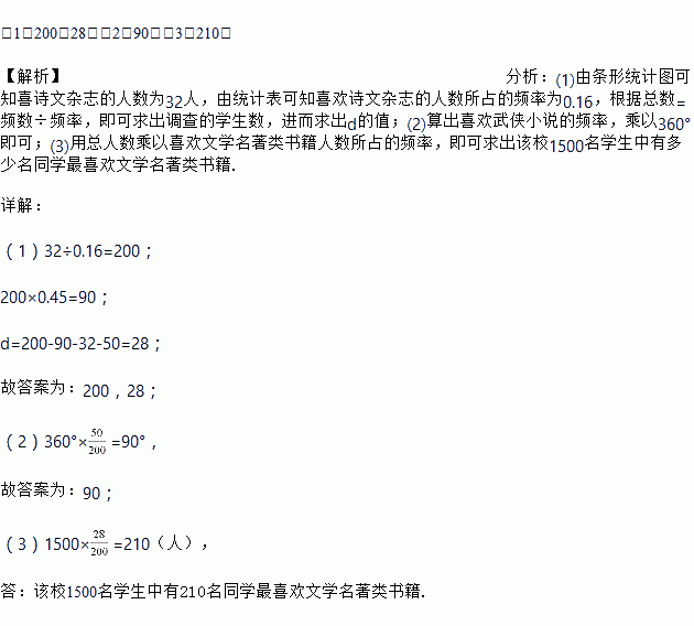 (3)试估计该校1500名学生中有多少名同学最喜欢文学名著类书籍?