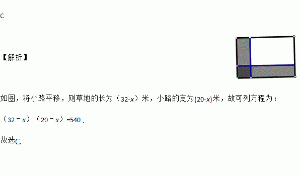 如图,在宽为20米,长为32米的矩形地面上修筑同样宽的道路(图中阴影部分),余下部分种植草坪,要使草坪的面积为540平方米,设道路的宽为x米,则下列方程正确的是( )