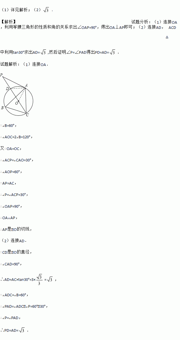 如图,点A、B、C分别是⊙O上的点,∠B=60°,AC=3,CD是⊙O的直径,P是CD延长线上的一点,且AP=AC.