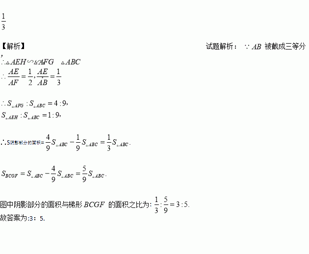 如图,△ABC是等边三角形,被一平行于BC的矩形所截,AB被截成三等分,则图中阴影部分的面积是△ABC的面积的______