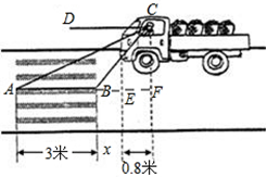 2013年1月1日,我国新交规法开始实施,如图,一辆汽车在一个十字路口遇到黄灯刹车停下,汽车里的驾驶员看地面的斑马线前后两端的视角分别是∠DCA=30°和∠DCB=60°,如果斑马线的宽度是AB=3米,驾驶员与车头的距离是0.8米,这时汽车车头与斑马线的距离x是多少? ![]()