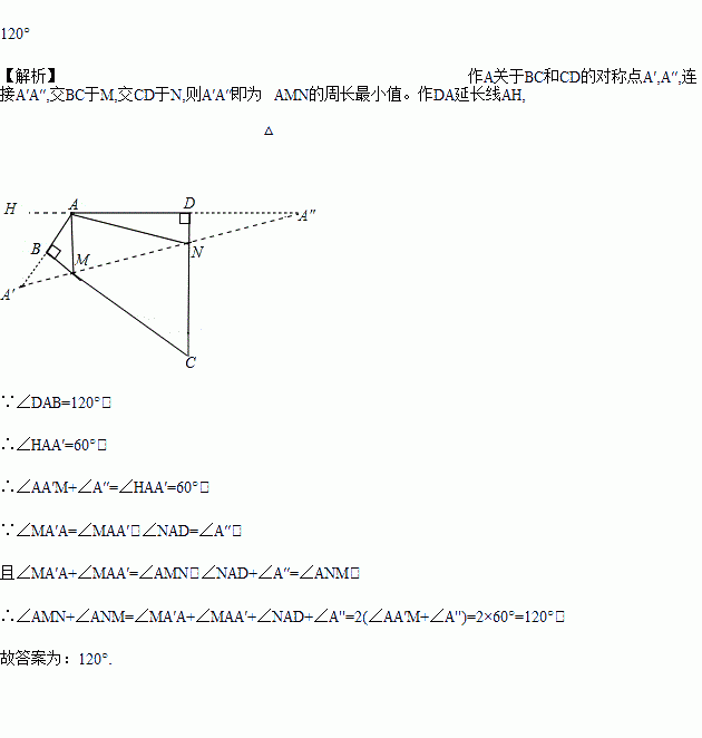 如图,四边形ABCD中,∠BAD=120°,∠B=∠D=90°,在BC、CD上分别找一点M、N,使△AMN周长最小时,则∠AMN+∠ANM的度数为_____________.
