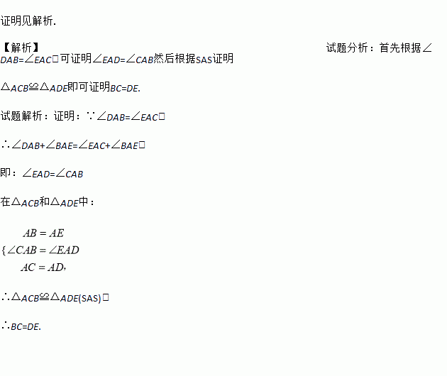如图,∠DAB=∠EAC,AB=AE,AD=AC.求证:DE=BC.