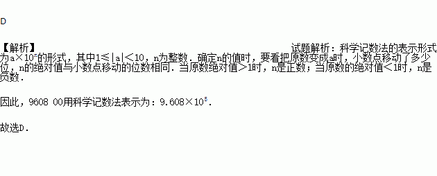 五一假期,黄石市退出了东方山休闲娱乐、传统文化展演、游园赏景赏花、佛教文化体验等精品文化活动,共接待旅游总人数9 608 00人次,将9 608 00用科学记数法表示为( )