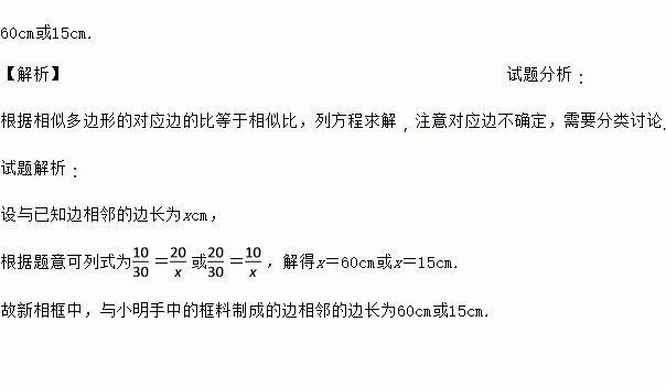 小明家有一个矩形的相框,其相邻两边长分别为10cm和20cm,小明还想做一个与该相框形状完全相同的相框,但手中只有一个30cm长的框料,那么在新相框中与小明手中的框料制成的边相邻的边有多长?