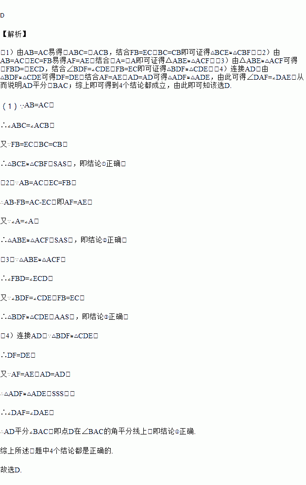如图,已知,,BE与CF交于点D,则对于下列结论:≌;≌;≌;在的平分线上其中正确的是( )