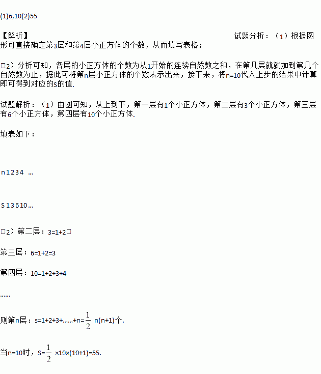 (1)6,10(2)55 【解析】试题分析:(1)根据图形可直接确定第3层和第4层小正方体的个数,从而填写表格; (2)分析可知,各层的小正方体的个数为从1开始的连续自然数之和,在第几层就就加到第几个自然数为止,据此可将第n层小正方体的个数表示出来,接下来,将n=10代入上步的结果中计算即可得到对应的S的值. 试题解析:(1)由图可知,从上到下,第一层有1个小正方体,第二层有3个...