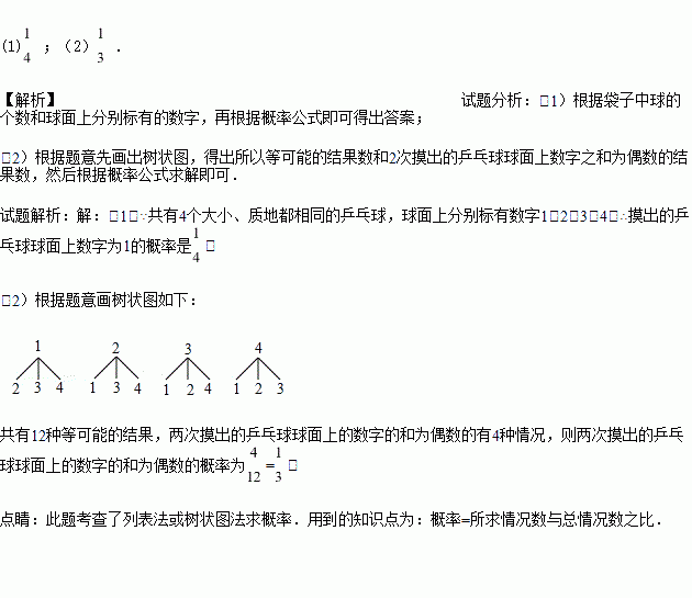 一只不透明的袋子中装有4个大小、质地都相同的乒乓球,球面上分别标有数字1、2、3、4.