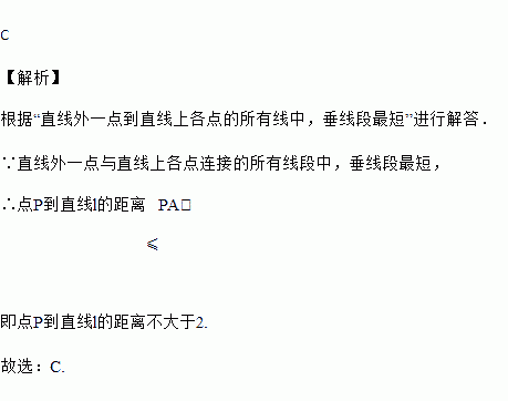点P是直线l外一点,A、B、C为直线l上的三点,PA=4 cm,PB=5 cm,PC=2 cm,则点P到直线l的距离( )