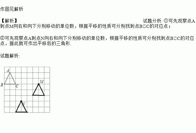 如图,在方格中平移三角形ABC,先使点A移到点M,画出平移后的三角形,再将A由点M移到点N,画出平移后的三角形。
