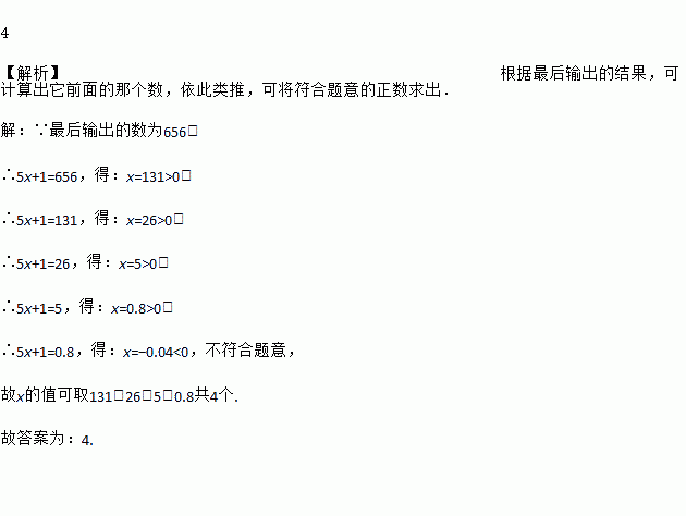 按如图的程序计算,若开始输入的值x为正数,最后输出的结果为656,则满足条件的x的不同值最多有_______个.