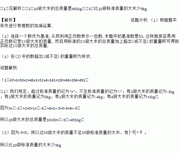(3)结合(2)中的计算说明,与10袋标准质量的大米相比,这10袋大米总计超过多少千克或不足多少千克?