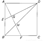 正方形ABCD中,E,F分别是AB与BC边上的中点,连接AF,DE,BD,交于G,H(如图所示)。求AG:GH:HF的值。
