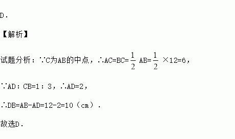 D. 【解析】 试题分析:∵C为AB的中点,∴AC=BC=AB=×12=6, ∵AD:CB=1:3,∴AD=2, ∴DB=AB-AD=12-2=10(cm). 故选D.