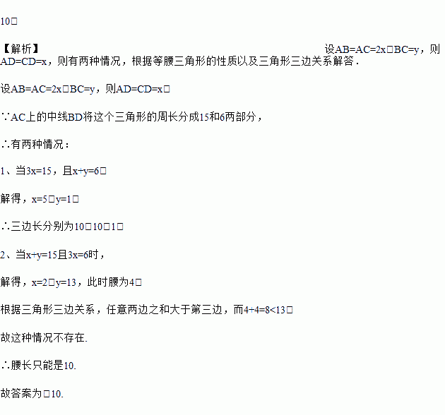 等腰△ABC 中,AB=AC,一腰上的中线 BD 将这个等腰三角形的周长分成 15 和 6 两部分,则这个三角形的腰长为_____.