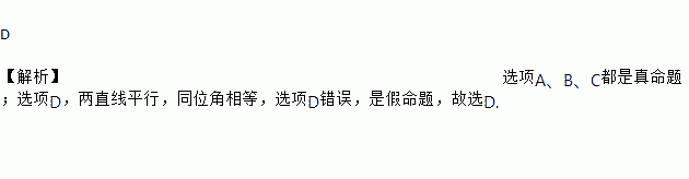 D 【解析】选项A、B、C都是真命题;选项D,两直线平行,同位角相等,选项D错误,是假命题,故选D.