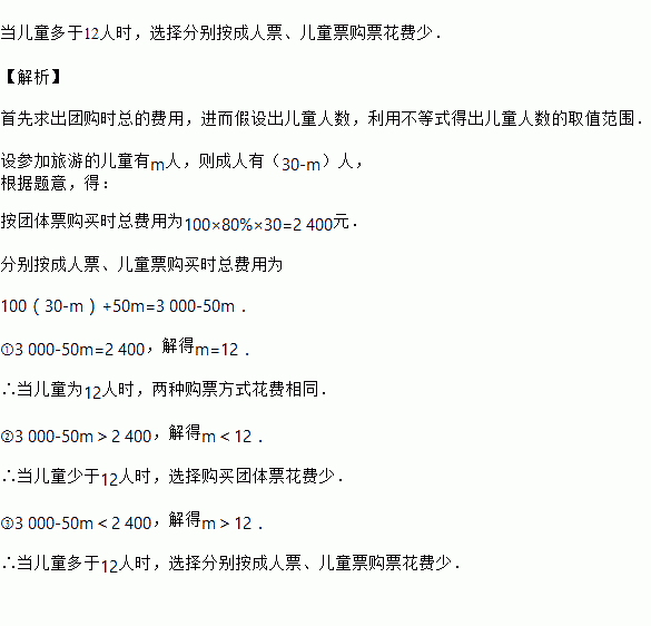某景区售出的门票分为成人票和儿童票,成人票每张100元,儿童票每张50元,若干家庭结伴到该景区旅游,成人和儿童共30人,售票处规定:一次性购票数量达到30张,可购买团体票,每张票均按成人票价的八折出售,请你帮助他们选择花费最少的购票方式.