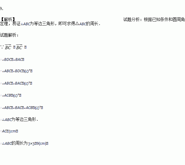 如图,⊙O是△ABC的外接圆,点D为上一点,∠ABC=∠BDC=60°,AC=3cm,求△ABC的周长.