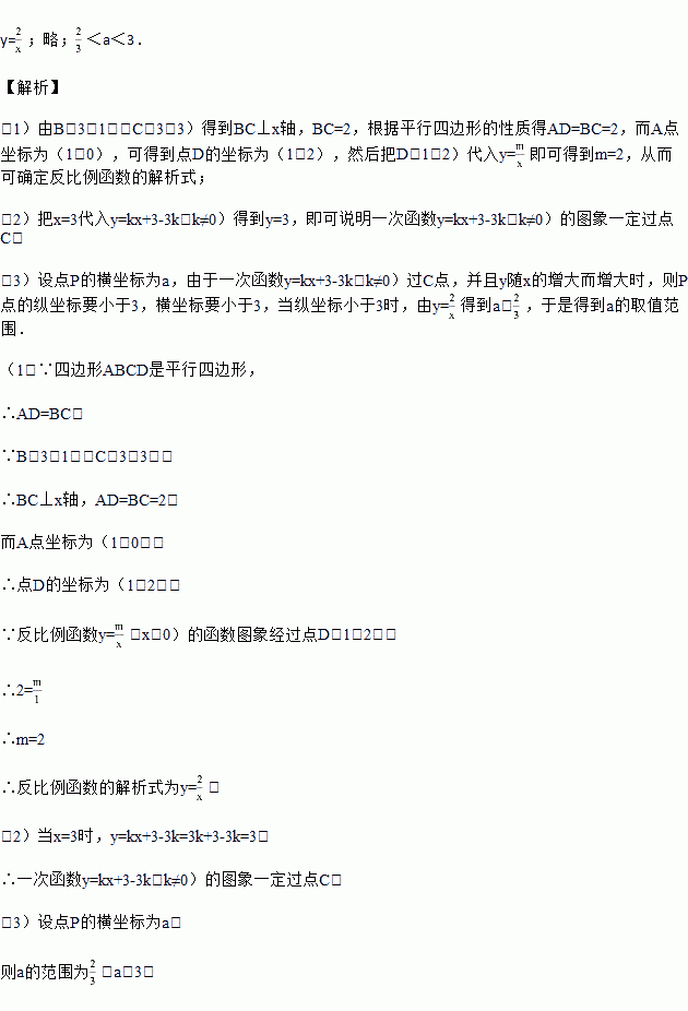 如图,四边形ABCD是平行四边形,点A(1,0),B(3,1),C(3,3).反比例函数y=
